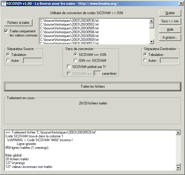 Cet utilitaire permet de convertir des codes SICOVAM en codes ISIN, ou inversement, et ce à l'intérieur de fichiers textes tels que des fichiers de cotations par exemple.