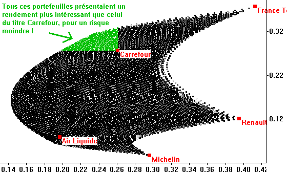 • On obtient généralement de meilleurs résultats avec un portefeuille qu'avec une valeur particulière. Par exemple, bien que Carrefour ait présenté sur la période un couple (risque,rendement) très intéressant avec un fort rendement pour un risque assez faible, il existe une multitude de portefeuilles présentant à la fois un risque plus faible que celui du titre Carrefour, tout en offrant un meilleur rendement : tous les portefeuilles situés au-dessus et à gauche du point symbolisant Carrefour étaient dans ce cas.