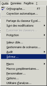 Si ce n'est pas le cas, ou si elle est grisée, sélectionnez l'entrée 'Macros complémentaires...' du menu 'Outils' et cochez la case 'Solveur' ou 'Complément Solver' dans la liste, avant de valider par 'OK'. L'entrée 'Solveur' du menu 'Outils' doit maintenant être disponible.